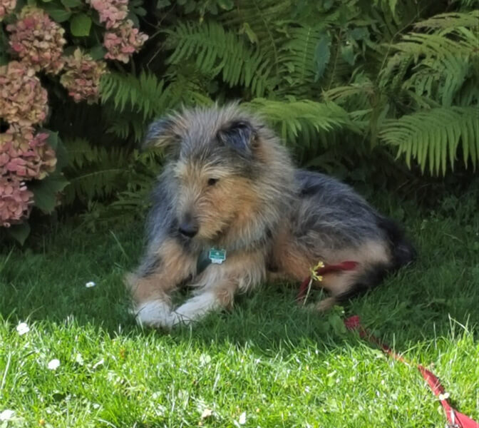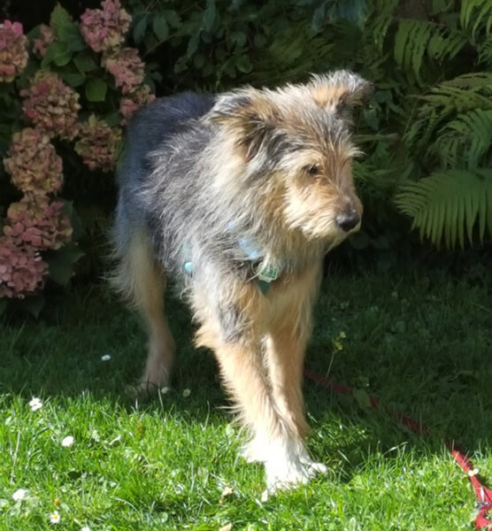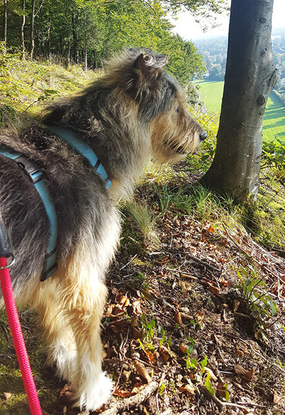 Er hat sich sehr gut eingewöhnt und liebt die Spaziergänge im Wald abseits der normalen Wege (es kommt wohl der Terrier etwas durch). Er ist total problemlos bei Hundebegegnungen, sehr entspannt und immer freundlich zu allen, die ihn bewundern und streicheln wollen.