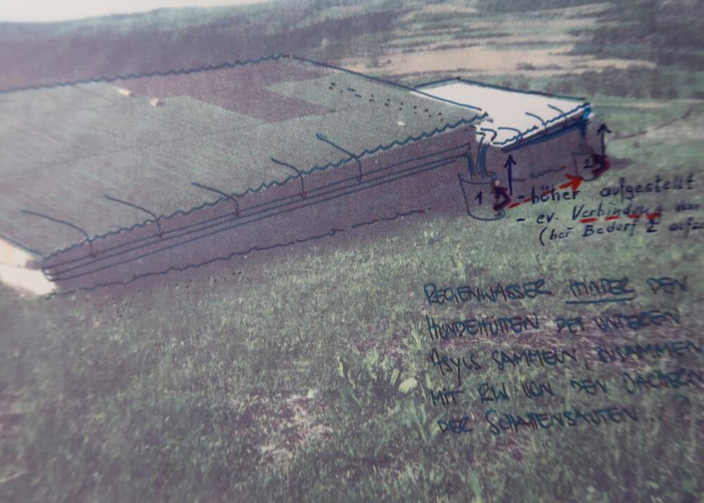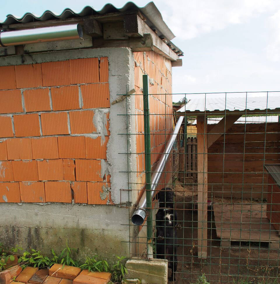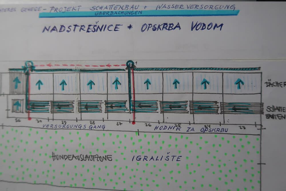 Weil in Svilos das Wasser kostbar ist - es ist kein Anschluss an die öffentliche Wasserleitung möglich - wurde eine große Dachfläche mit neuen, weißen Dachplatten bedeckt, damit das dort gesammelte Regenwasser sauber bleibt. Die neuen Überdachungen in den Gehegen und dieses neue große Dach haben jetzt Regenrinnen, die zu einem großen Wassersammler führen. Von dort wird das Wasser zu einer Zapfstelle geleitet und kann für die Versorgung dieses Heimbereichs ohne großen Aufwand verwendet werden.