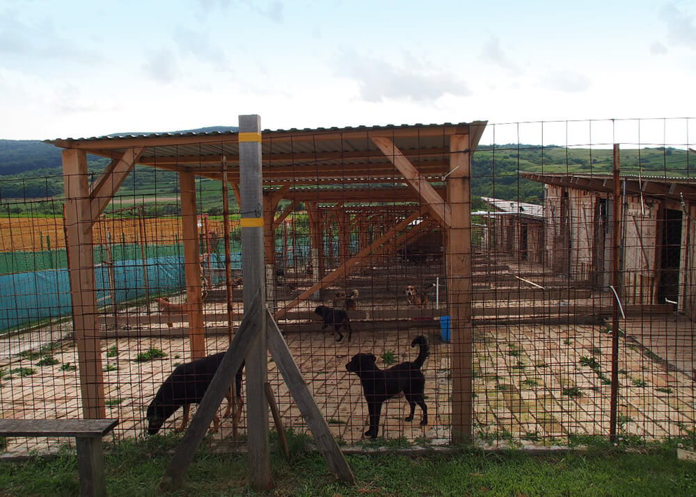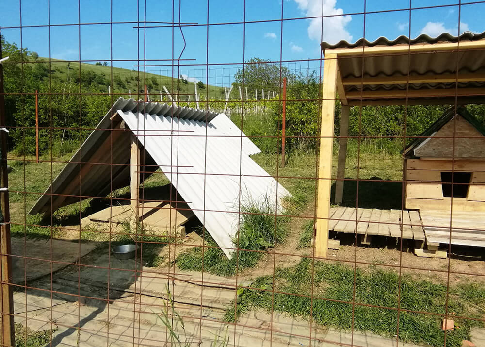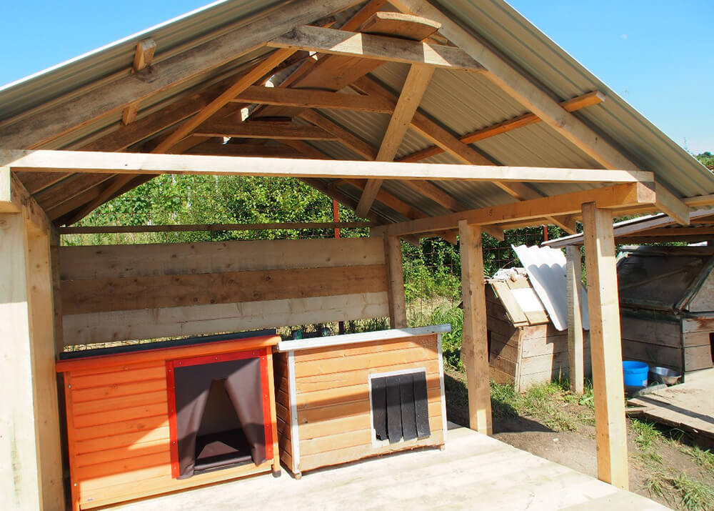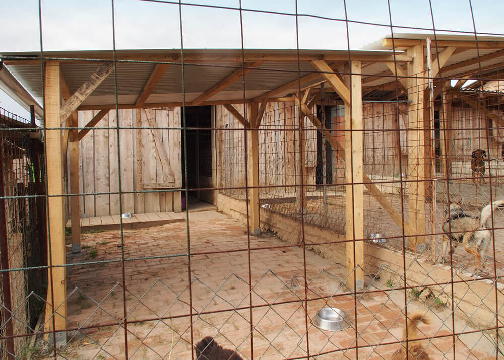 Nachdem im unteren Heimbereich alle Gehege mit Ziegeln gepflastert wurden und das Matschproblem gelöst wurde, wurden in den letzten Monaten jetzt auch in jedem Gehege in der Mitte Überdachungen gebaut, sodass die Hunde den ganzen Tag Schatten haben, der sich mit der Sonne entlang des Geheges bewegt. So können sie bei Sonne, aber auch Regen und Schnee draußen an der frischen Luft bleiben und müssen nicht hinein in ihre Behausungen.