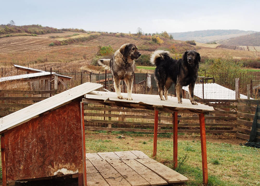 Mascha und Tascha, die zwei Sarplaninac-Hündinnen, die ihr Leben wahrscheinlich im Tierheim verbringen werden, bekommen auch eine geräumige Terrasse und einen großen Schattenbau.