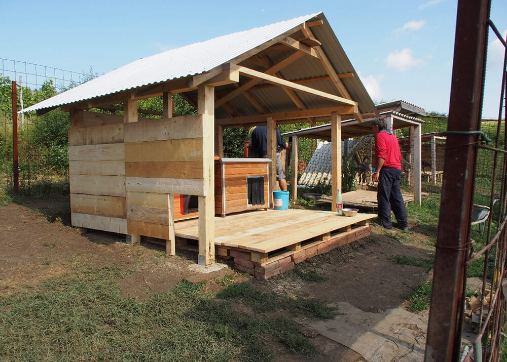 Auf dem Auslaufplatz im unteren Heimbereich entsteht gerade ein Schattenbau, sodass die Hunde auch im Sommer bei höheren Temperaturen den Platz nutzen können. Drei Gehege haben nur provisorische Schattenbauten. Dort werden ordentliche Überdachungen mit Terrassen gebaut, so wie in anderen Gehegen.