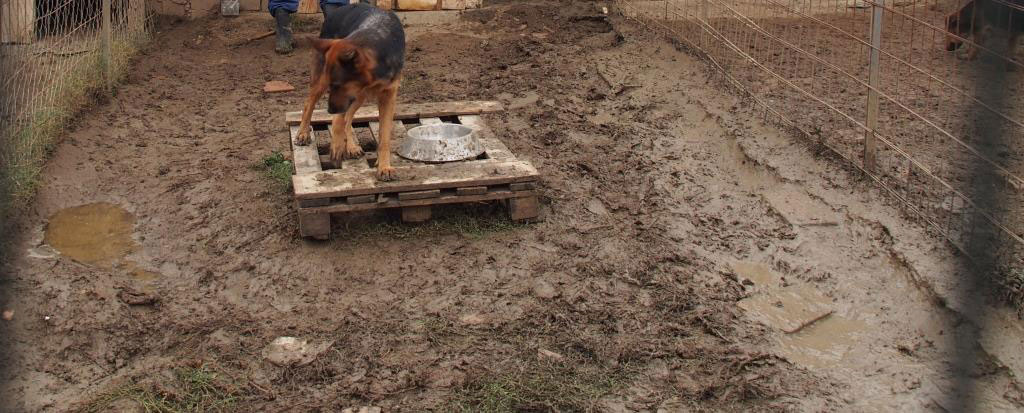 Damit verbunden ist das nächste große Problem, das dringend gelöst werden muss: der Matsch! Bei Regen – und dazu reicht schon ein Regentag – verwandelt sich der Boden in den Gehegen in tiefen Matsch. Die Hunde und die neuen Holzterrassen bzw. das Innere der neuen Hütten sind in kürzester Zeit damit bedeckt. Die Angestellten können sich in den Gehegen kaum bewegen und der Matschbelag trocknet anschließend in den Hütten und auf den Terrassen fest und kann nur sehr mühsam entfernt werden. Es ist auch schon nach ein paar Stunden Regen nicht mehr möglich, mit dem Auto ins Heim zu fahren, was schlimmstenfalls bedeutet, dass zum Beispiel schwere Futtersäcke von der Straße zum 200 Meter entfernten Haupthaus getragen werden müssen.