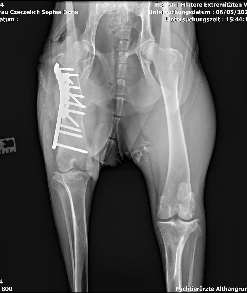 Im Januar durfte Doris zu einer liebevollen Pflegestelle nach Österreich ziehen und hat seitdem die dringend benötigte Operation zur Stabilisierung des Knochens erhalten. Dank der großartigen Versorgung bei den Fachtierärzten Althangrund konnten wir die Kosten für diese lebensverändernde Operation von 8.000 Euro auf 5.000 Euro senken.