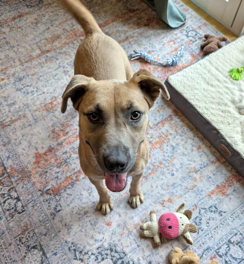 Die Hündin mit den schönen honigfarbenen Augen ist eine fröhliche, aufgeweckte, völlig unkomplizierte und sehr freundliche junge Hundedame, mit einem sanften Gemüt, die schnell die Herzen der Menschen erobert und jedem sofort zugeht. Sie ist extrem liebesbedürftig und fordert Streicheleinheiten vehement ein, wünscht sich aber ebenso Beschäftigung und Training, denn sie hat viel Freude am Erlernen neuer Dinge und ist auch ein geeigneter Partner für Joggingrunden. Sie ist leinenführig, gehorsam und kennt bereits die Grundkommandos. Aufgrund ihrer Gutmütigkeit kann man ihr den Futternapf oder einen Knochen problemlos wegnehmen. Sie wäre ein toller Familienhund und auch eine Bereicherung für Familien mit älteren Kindern.