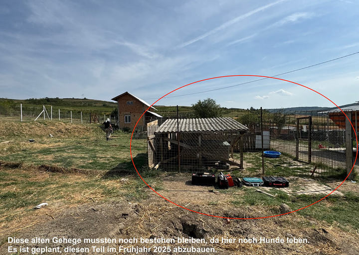 Im Frühjahr 2025 werden hier noch die weiteren alten Gehege abgerissen werden und an dieser Stelle ein weiterer Auslaufplatz entstehen. Auch hier sollten die Hunde – wie im Ost-Teil des Tierheims – direkt auf den Auslaufbereich laufen können, sobald die Gehegetür geöffnet wird.