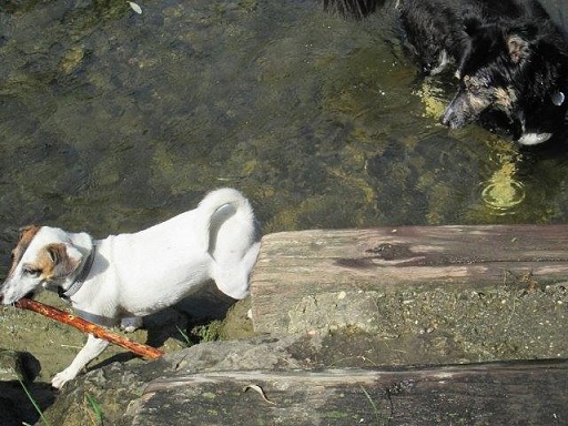 Als es bei uns hier unerträglich heiß war, bin ich mit Annabell und dem Hund meines Sohnes jeden Tag an die Jagst. Lilli holte das Stöckchen aus dem Wasser und Annabell sprang am Rand des Flusses hin und her und schnappte es sich, sobald es nahe genug für sie war. Manchmal plumpst sie auch ungewollt ins Wasser, das mochte sie aber nicht. Es machte mir sehr viel Freude die Hunde so glücklich und vereint zu erleben. Sie sind immer zusammen denn sie suchen die Nähe des anderen. Ich habe auch noch nie erlebt das einer von ihnen den anderen anknurrt.