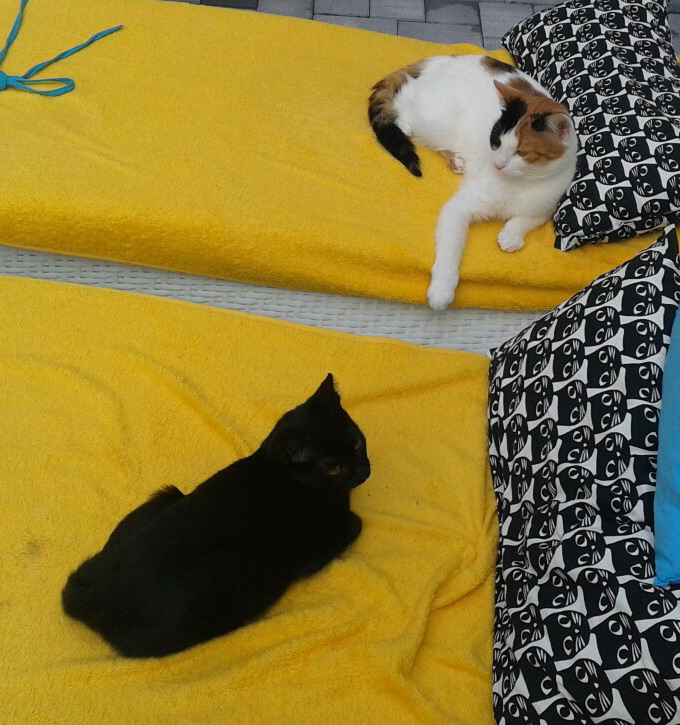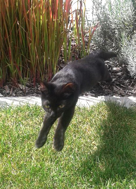 Obwohl er anfangs etwas vorsichtig war, hat er schon an seinem zweiten Tag bei uns ein Vollbad in unserem Teich genommen! Heute fetzt er schon fleißig mit seinen Spielmäusen durch das Haus und auch der Kratzbaum ist nicht mehr sicher vor ihm. Ach ja, auch auf den Gartenliegen scheint es zukünftig noch enger zu werden :-).