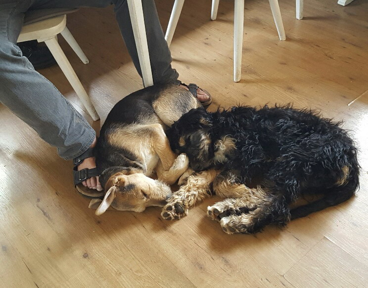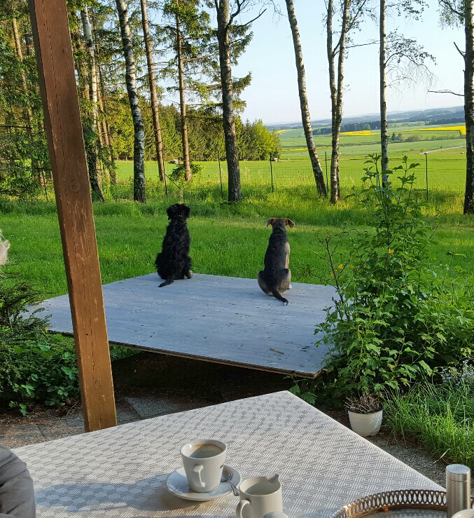 Sie bewegen sich hier also mit großer Selbstverständlichkeit, als seien sie immer schon hier gewesen. Wir haben noch nie derart entspannte Hunde gesehen. Besonders schätzen sie ihr „Hundezimmer“, ein kleiner Schrankraum, der zum Wald hin liegt und daher nicht so sonnig ist. Wenn sie müde sind, ziehen sie sich dorthin zurück. Ebenso genießen sie es, wenn bei kühleren Temperaturen der Holzofen in der Küche eingeheizt wird. Dann liegen sie dort und betrachten das Feuer.