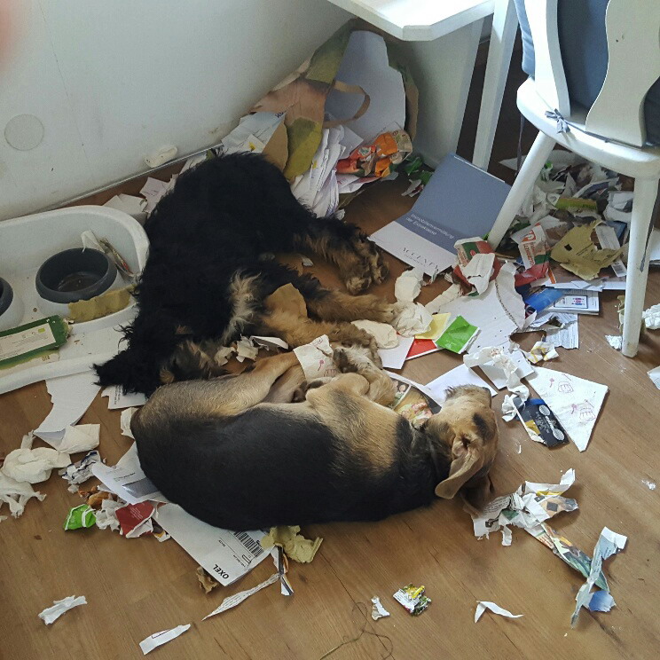 Jetzt halten sie sich die meiste Zeit im Garten auf, jagen sich gegenseitig oder beobachten von der Hundeplattform aus die Gegend. Manchmal sind sie auch ein bisschen schlimm … (Der Papiermüll muß künftig wohl anderweitig untergebracht werden.)