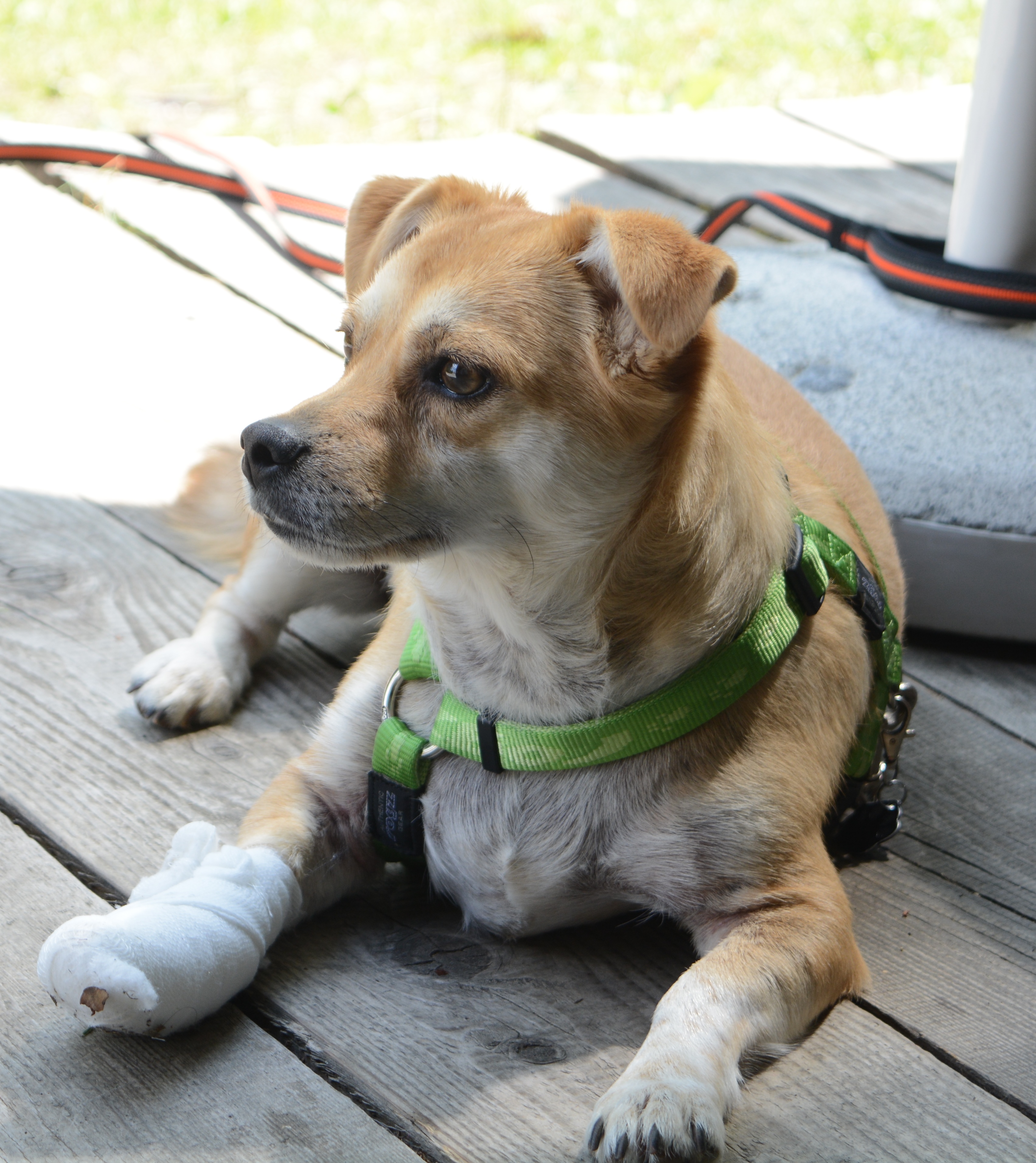 Warum der Verband am zweiten Foto? Tja, da meinte er, er musste auf so eine Gittertreppe raufgehen (wo er normalerweise nicht mal ansatzweise raufgeht) und er wollte dann doch schnell runter und beim Hinuntergehen hat er sich eine Kralle ausgerissen. Zum Glück war sie gleich ganz draußen und wir mussten nicht noch einen Rest rausziehen. Mittlerweile ist schon wieder ein Stückchen nachgewachsen.