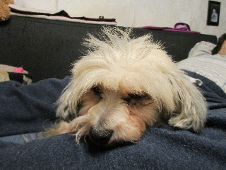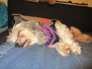 Sie läuft einem immer hinten nach und schaut ob man noch da ist. Sie liebt es gestreichelt zu werden und lässt sich auch gerne noch heben. Da sie so was unkompliziert von der ersten Minute an ist - haben wir uns doch entschieden sie doch gleich heute zu baden, da sie ja auch auf dem Sofa und im Bett schlafen darf. War dabei so brav - als wäre das die normalste Sache der Welt - sogar das Köpfchen durfte dabei nass werden. Danach hat sie sich brav mit dem Föhn trocknen lassen. Obwohl es bei uns sehr war im  Zimmer ist - haben wir ihr für kurze Zeit einen Pullover angezogen. (siehe Foto) Jetzt schläft sie brav auf der Couch - schaut aber immer wieder ob wir  noch da sind -und wedelt dann freudig mit dem Schwänzchen und legt zufrieden ihr Köpfchen wieder hin.