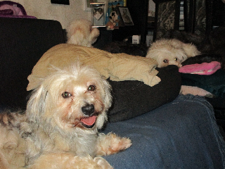 Zu Hause hat sie im Garten brav ihr Geschäft verrichtet und ist gleich  hinter den zwei Maltesern ins Haus marschiert - als wäre sie hier schon immer zu Hause.. Katzen sind überhaupt kein Problem - auch die Katzen haben sie gleich akzeptiert. Wichtiger Raum war zuerst - die Küche - wo es gleich geputzte Kuttel gegeben hat - dürfte sie jedoch nicht kennen - haben ihr aber total gut geschmeckt. Zum Nachtisch gab es zwei  Hühnerkaustangerln (die unsere beiden immer statt Zähneputzen bekommen).