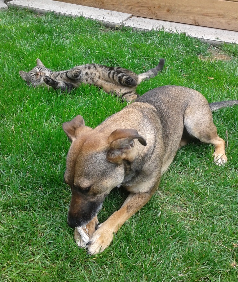 Mir geht es rundum gut, besonders mit einem Rinderkopfhautsnack im Garten :) Ich glaube, das Foto sprich für sich. Ach ja, mein Katzenkumpel Konrad und ich chillen gerne auch mal gemeinsam.