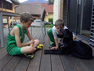 Nach den ersten zwei Tagen hier in Kärnten musste ich jeglichen Besuch absagen und Routen wählen für unsere Spaziergänge, wo möglichst kaum Menschen sind, da er schon so sehr verängstigt war. Sie können sich vorstellen, dass alle ihn sehen und "spüren" möchten, darauf müssen nun unsere Freunde warten. Im Dorf gibt es Häuser, wo er lieber auf die andere Straßenseite geht, dabei hat er nie jemanden dort getroffen. Als hätte er einen siebten Sinn und schleicht sich wirklich flach davon. Wenn es Menschen draußen stehen oder uns jemand entgegen kommt, wird er unsicher und würde am liebsten auf dem Absatz kehrtmachen. Da ich die meiste Zeit mit ihm verbringe, sind wir zwei schon ein sehr gutes Team, er zeigt Vertrauen und schmiegt sich sofort an mich, wenn andere Leute uns nähern. Wenn wir mit den Kindern spazieren gehen, behaltet er mich auch genau im Auge und wählt immer die Geschwindigkeit, die ich habe. Egal, wer ihn führt, derzeit passt er sich ausschließlich an mich an, ich muss auch immer dabei sein, wenn wir spazieren gehen, sonst will er nicht gehen...