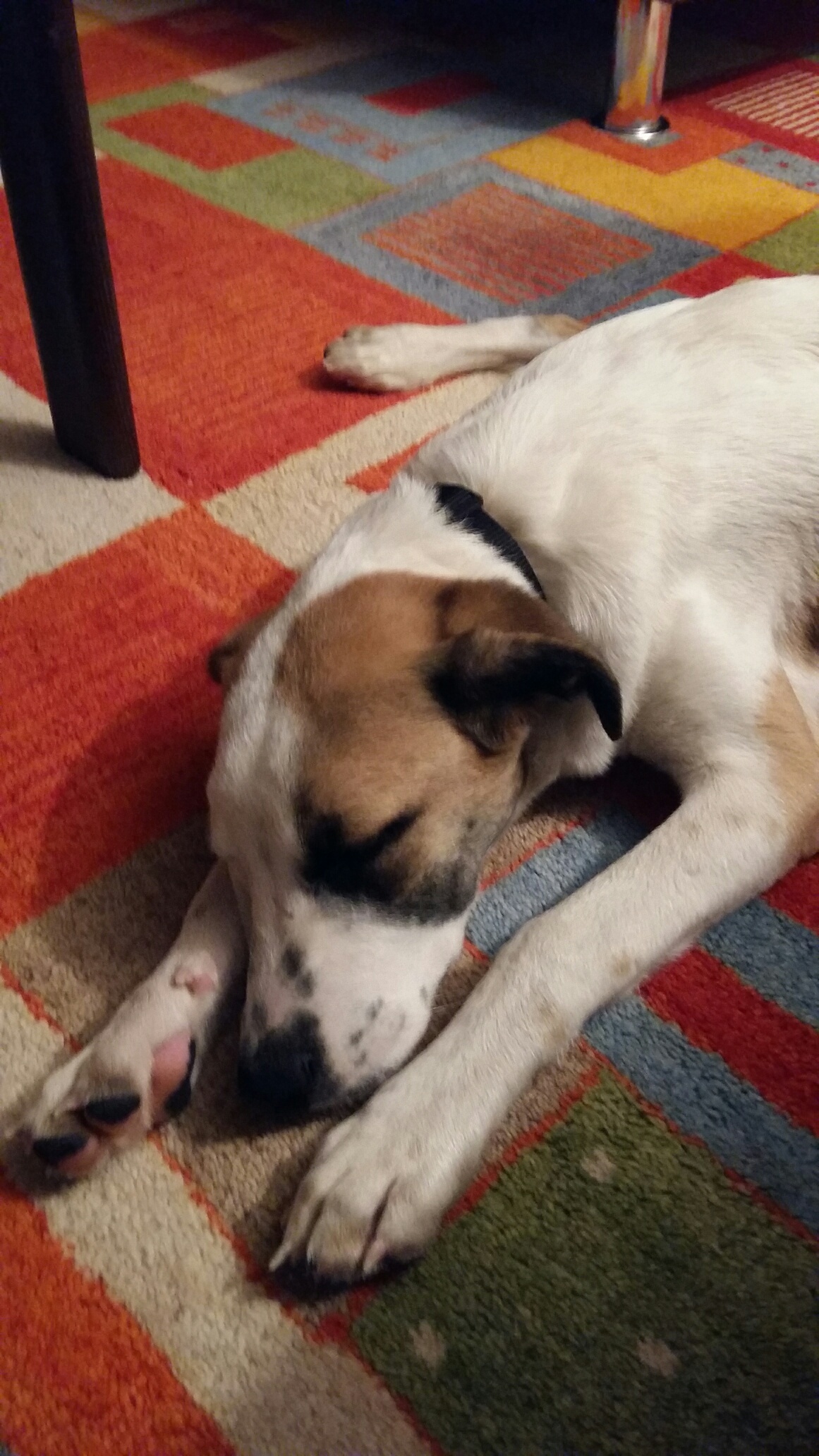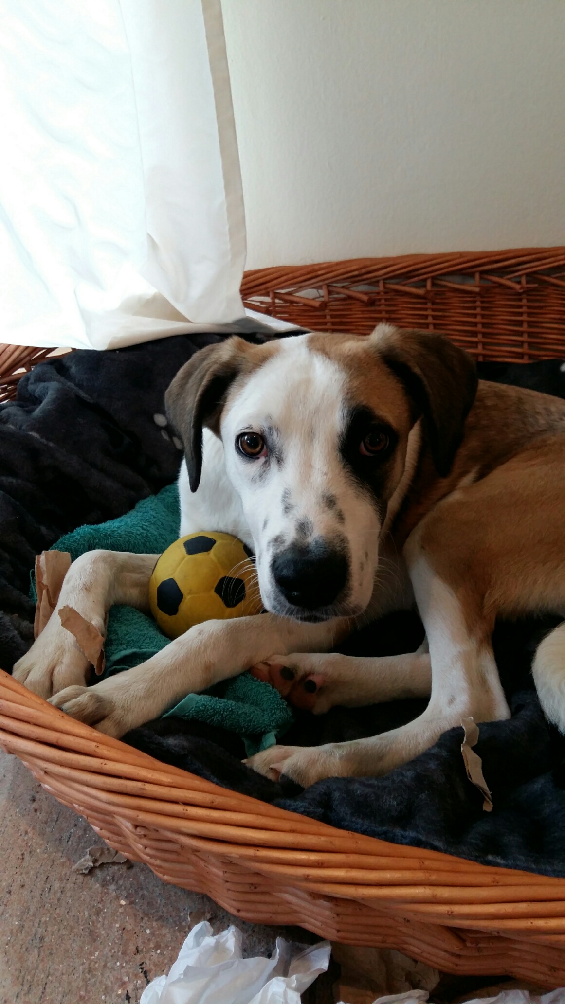 Inzwischen ist der Durchfall besser geworden und ich glaube er fühlt sich wohl bei uns. Wir haben ihn jedenfalls alle ins Herz geschlossen, er ist ein wirklich zutraulicher, fröhlicher und verspielter Kerl. Kartons zerreissen mit Leckerlisuche spielt er momentan am liebsten. :)