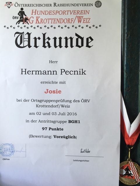 Wir könnten stolzer auf unsere Josie nicht sein! Ein "Vorzüglich" bei der BGH 1 erreicht! Josie ist ein Herzenshund und es könnte nicht schöner sein !! Danke für Ihr Vertrauen & alles Gute weiterhin!