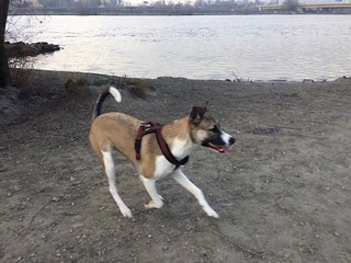 Wir gehen jeden Tag ausgiebig spazieren, meist auf große Wiesen wo ich weit sehen und gut laufen kann. Dort bin ich entspannt und finde auch immer wieder andere nette Hunde mit denen ich mich super verstehe und wie verrückt herumtollen kann. Wenn ich richtig gut drauf bin, springe ich wie eine Antilope durch das Gras - das sieht lustig aus und meine Menschen lachen dann immer. Die Stadt mit ihren vielen Menschen und dem Verkehr mag ich noch nicht so sehr, aber langsam gewöhne ich mich daran, weil meine Menschen mich doch immer wieder damit vorsichtig in Kontakt bringen. Wenn ich an meiner Leine gehe und so den Kontakt zu Herrchen oder Frauchen spüre, weiss ich ich bin in Sicherheit, weil ich mich auf sie verlassen kann. Ich darf jeden Tag mit meinen Menschen ins Büro fahren, wo ich meine Plätzchen habe; so vermisse ich sie auch nicht so. Ich kann aber für ein paar Stunden auch schon gut alleine zuhause bleiben und bin da immer sehr brav.