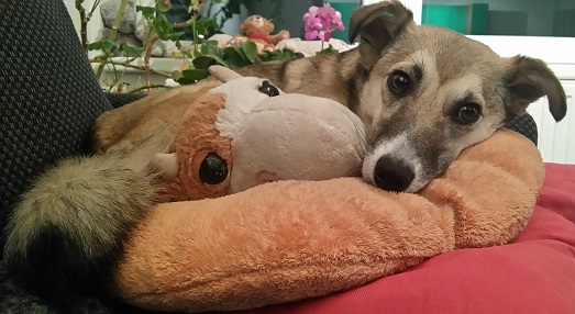 Katy ist inzwischen ein sehr kuscheliger Hund geworden, am liebsten liegt sie im Schoß und lässt sich streicheln.