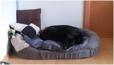 In der ersten Woche habe ich mein Herrchen verärgert, denn ich habe mich auf seinen Platz im Ehebett gelegt und das hat ihm scheinbar gar nicht gefallen. Er hat mich gefragt, ob ich im Tierheim auch in einem Bett geschlafen habe – ha,ha, ha, der kann aber witzig sein. Aber mittlerweile habe ich mein eigenes orthopädisches Hundesofa bekommen und es liegt sich darin viel besser als in seinem Bett.