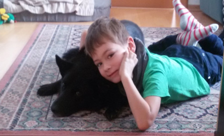 Den jüngsten Mitbewohner mit Namen Peter (6 Jahre alt und ist das Enkelkind von meinem Frauchen und Herrchen) finde ich ganz süß. Er will immer mit mir spielen, streichelt mich, nimmt mich in den Schwitzkasten und busselt mich ab.  Er ist ein bisschen traurig, wenn ich nicht mit ihm springe und dabei belle - aber ich traue mich noch nicht  so richtig, ich könnte ja jemanden erschrecken.