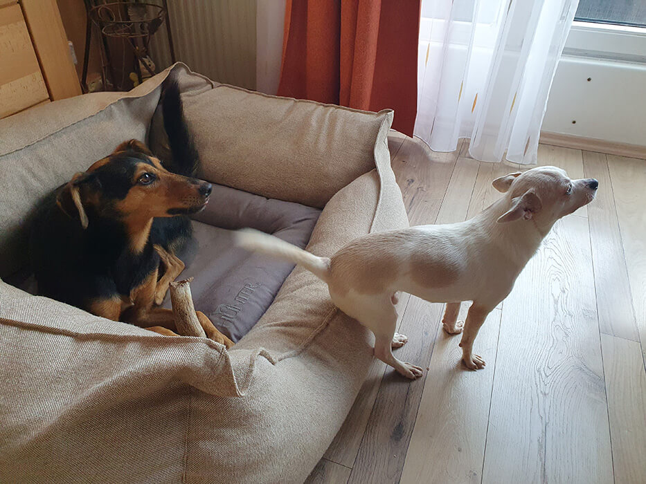 Lion hat schon mehrere Ausflüge mit uns in dem Wald und an die Donau mit Begeisterung absolviert. Auch mit seiner neuen großen Hundeschwester Bea (Bea ist 2022 von Svilos ebenfalls über Animal Care zu uns gekommen) versteht er sich schon bestens.