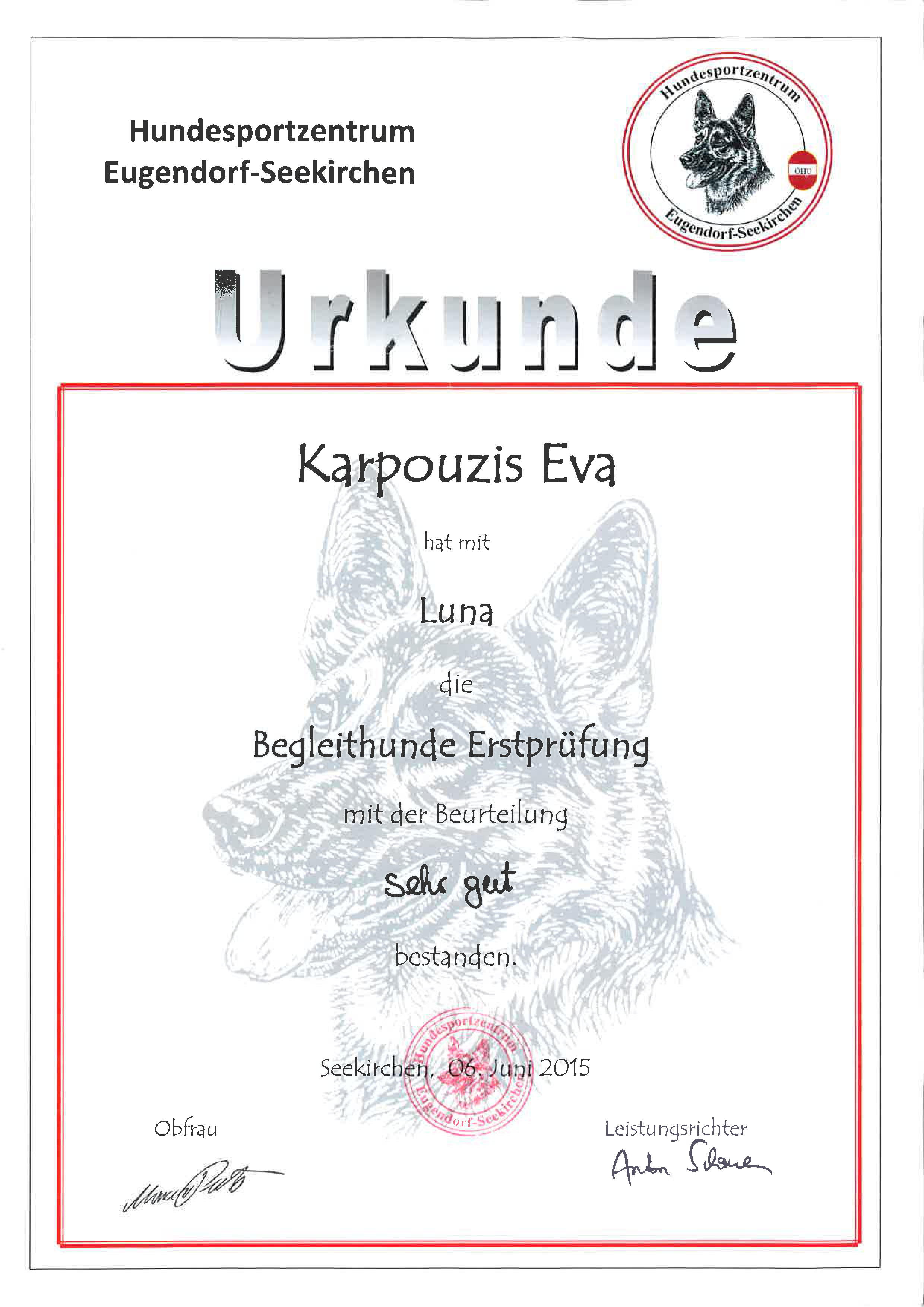 Nachdem der erste Ausbildungsplatz nicht das unsere war, haben wir jetzt einen tollen ÖHU-Verein in der Nähe gefunden und letzten Samstag die erste Unterordnungsprüfung abgelegt. Das tolle Ergebnis findest du anbei, ebenso ein Foto. Schon beim Kurs stellte sich heraus, dass ihr die Ausbildung Spaß macht und sie einer der gelehrigsten Hunde war. Im Herbst geht es dann dort mit Agility weiter.