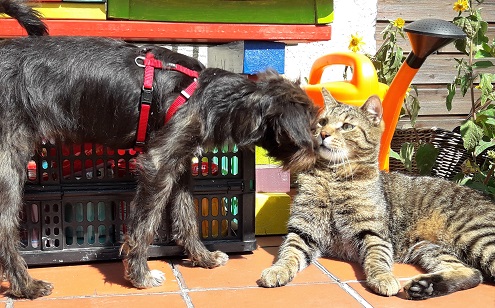Kommandos wie ‚sitz‘ oder ‚hier‘,… müssen wir erst lernen. Bisher stand vor allem Beziehungspflege auf dem Programm. Mit unserem Kater Misu versteht Merlin sich gut. Er will ihn immer zum Spielen auffordern was Misu jedoch mit stoischer Ruhe ignoriert. Die Katze Tira muss sich erst an Merlin gewöhnen. Sie ist recht scheu und flüchtet gerne wenn ‚Fremde‘ da sind. Es wird wohl noch eine Zeit dauern bis die beiden Freunde werden. Aber die haben wir ja….