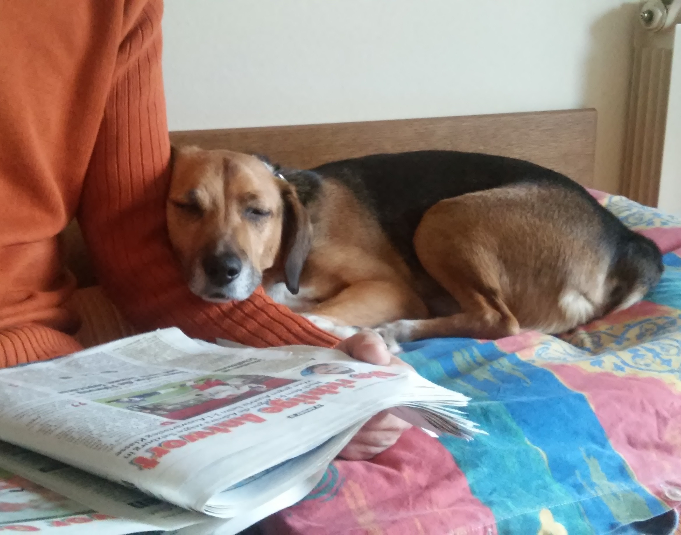 Ein neues Enkelkind ist gekommen, Pongo muss es bewachen. Schaut nach, wenn er weint, sitzt daneben, wenn er gewickelt wird und geht natürlich mit spazieren. Überglücklich ist er jetzt, da mein Mann in Pension ist, das genießen sie, wie am Foto ersichtlich, sehr.