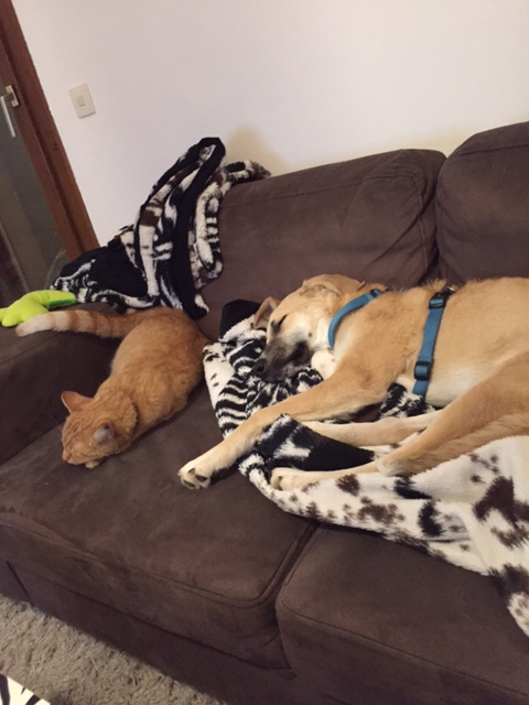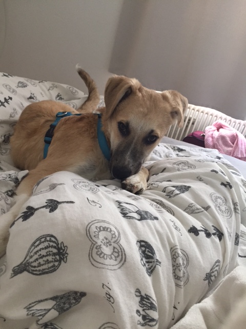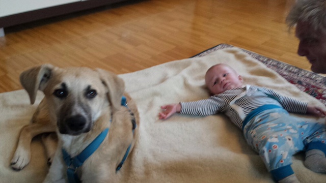 habe gerade die Bilder gesehen die sind ja entzückend, wie winzig sie da war kann man sich gar nicht mehr vorstellen. Sheila ist seit 3 Wochen stubenrein und hat sich sehr gut eingelebt sie kuschelt gerne mit uns im Bett und spiel gerne mit Bongo mit Kindern hat sie keine Probleme, allerdings panische Angst vor Männern und fremder Umgebung. Morgen haben wir den ersten Tierarzttermin (leider nicht früher da unser Tierarzt im Urlaub war) und wir überlegen eine Hundetherapeutin zuzuhohlen damit sie ihre Ängste überwinden kann. Sonst gehts ihr aber total gut und mittlerweile geht sie bei Fuß und beim Kinderwagen und macht auf Kommando Sitz sie lernt sehr schnell und freut sich auf neue Aufgaben und Spiele und ich staune immer wieder aufs neue wie einfühlsam und vorsichtig die mit Kindern umgeht. Passend zum Welthundetag kuscheln wir noch am Sofa.