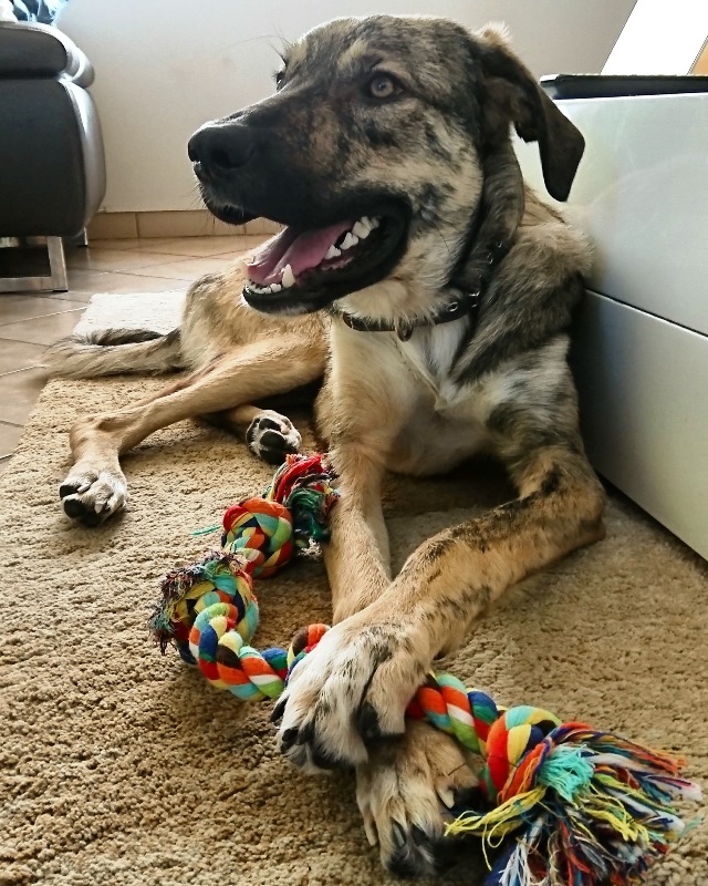 Zuhause zählen Fressen und Kuscheln zu seinen Lieblingsbeschäftigungen. Spielis werden in Windeseile zerlegt, besonders ergiebig und beliebt sind daher Taue.