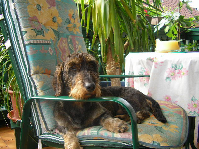 Da er sich soviel bewegt, wird er aber trotzdem nicht dick. Er ist begeisteter Autofahrer, Fahrradfahrer und Jogger. Daher reißt ihm schon abends um 19.00 Uhr der Faden und er schläft durch bis morgens, allerdings nur bis 4.00 Uhr. Dann ist er wieder voller Power, kommt ins Bett gesprungen und weckt uns. Eine Stunde später geht es dann mit Mechthild schon zum Joggen. Danach natürlich fressen. Immer volles Programm.
