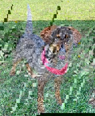 Die Schulterhöhe der Hündin beträgt 38 cm, und sie wiegt ca. 9 kg.